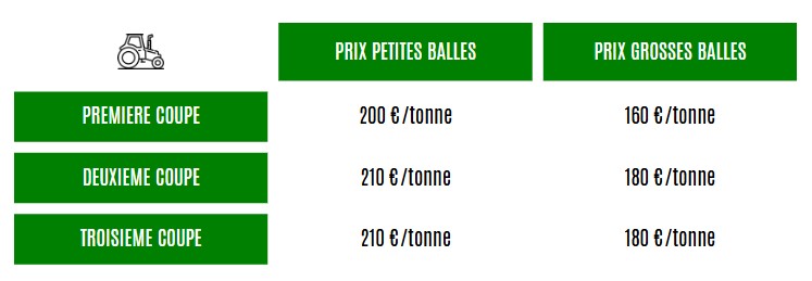 Ces prix ne sont pas contractuels, ils sont fixés à partir de mercuriales des ventes réalisées avec le négoce. Il s’agit de prix HT (TVA 5,5%), au départ de la ferme, sans le transport, par grosse quantité. Le Comité du Foin de Crau est un syndicat de producteurs, n’étant pas une structure commerciale, il n’est pas en mesure de réaliser des devis pour des livraisons de foin.